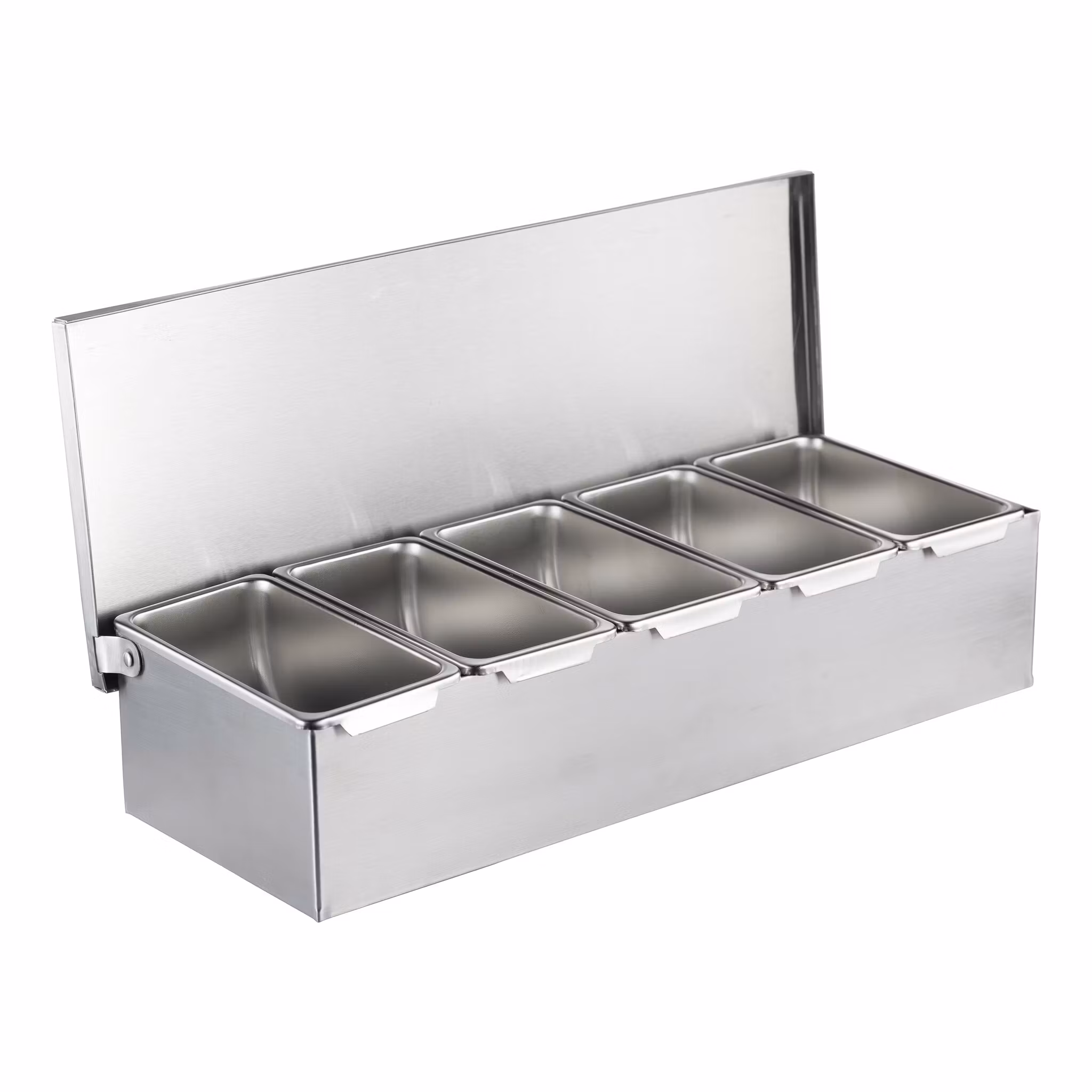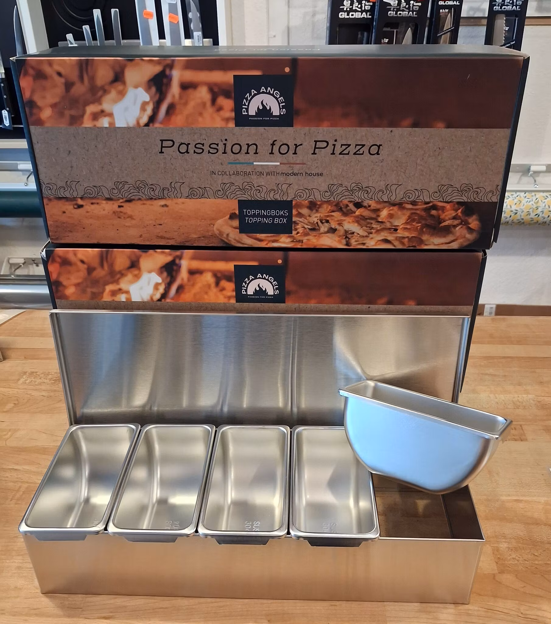 Modern House Pizza Angels toppingbox eller toppinglåda med 6 stycken boxar totalt 2 L i borstat stål är mycket bra att ha för organiserad hantering av ingredienser. Den uppdelade konstruktionen ger god överblick och effektiv användning.